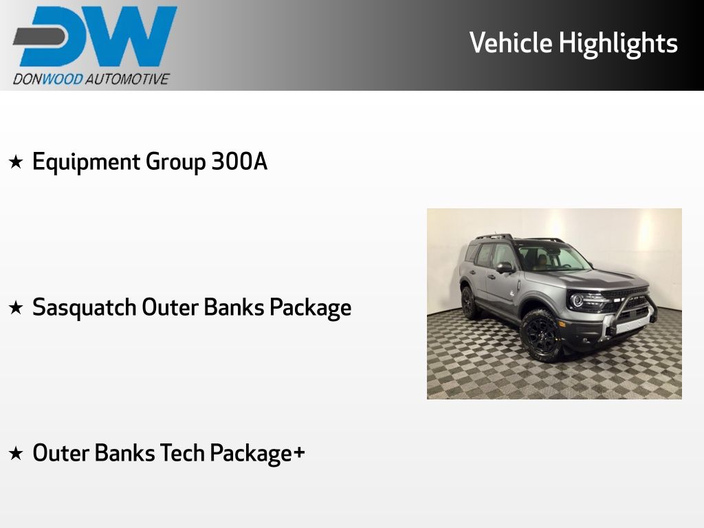 Bronco Sport Outer Banks, 4WD, 110V/400W AC Power Outlet, 2nd Row Carpeted Seatback, Auto-dimming Rear-View mirror, Automatic temperature control, Auxiliary Switches & Wiring, B&O Sound System by Bang & Olufsen, Brush Guard, Class II Trailer Tow Pack w/Trailer Sway Control, Connected Navigation, Equipment Group 300A, Fender Tie Downs, Front & Rear Black Bumpers, Front Driver/Passenger Seat Back Map Pockets, Fully automatic headlights, Garage Door Transmitter, HD Radio, Heated front seats, Heated steering wheel, High Clearance Fender Flares, HOSS 2.0 Off-Road Suspension, Interior Grab Handle, Memory seat, Outer Banks Tech Package+, Power driver seat, Power passenger seat, Premium Trimmed Front Bucket Seats w/Ebony/Roast, Rain Sensing Wipers, Recovery Hooks, Remote Keyless Entry, Sasquatch Outer Banks Package, Steering wheel mounted audio controls, SYNC 4 w/Enhanced Voice Recognition, Trail Control for Off-Road, Wheels: 17" Ebony Black-Painted Aluminum. Price includes the following rebates:$3000 - Retail Customer Cash. Exp. 04/30/2026