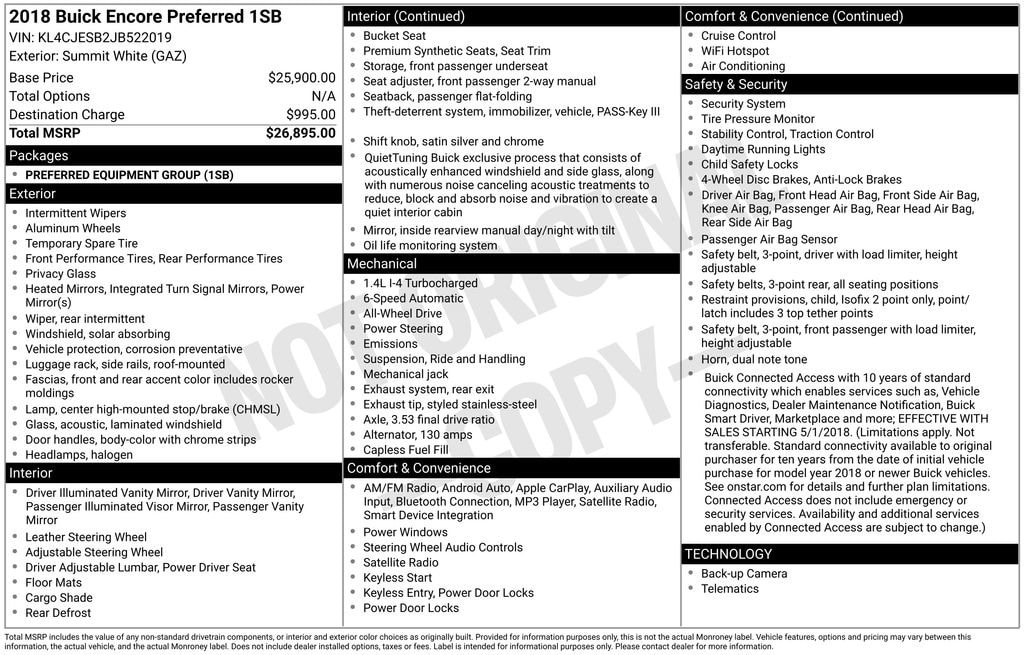 Clean CARFAX!, This Buick Encore Preferred has many features and is well equipped including, Apple CarPlay, Great Price, Backup Camera, All-Wheel Drive, 6 Speakers, 6-Speaker Audio System, ABS Brakes, Air Conditioning, AM/FM Radio: SiriusXM, Apple CarPlay/Android Auto, Brake assist, Cloth w/Leatherette Seat Trim, Compass, Delay-off headlights, Driver vanity mirror, Driver's Seat Mounted Armrest, Electronic Stability Control, Emergency communication system: OnStar Guidance, Exterior Parking Camera Rear, Front Bucket Seats, Front reading lights, Front wheel independent suspension, Fully automatic headlights, Heated door mirrors, Illuminated entry, Low Tire Pressure Warning, Outside temperature display, Panic Alarm, Passenger vanity mirror, Power door mirrors, Power driver seat, Power steering, Power windows, Preferred Equipment Group 1SB, Radio: Buick Infotainment System AM/FM Stereo, Rear seat center armrest, Rear window defroster, Rear window wiper, Remote Keyless Entry, Ride & Handling Suspension, Security System, SiriusXM Satellite Radio, Speed control, Speed-Sensing Steering, Split folding rear seat, Steering wheel mounted audio controls, Telescoping Steering Wheel, Tilt Steering Wheel, Traction Control, Trip Computer, Variably intermittent wipers, Wheels: 18" Machined-Face Alloy.