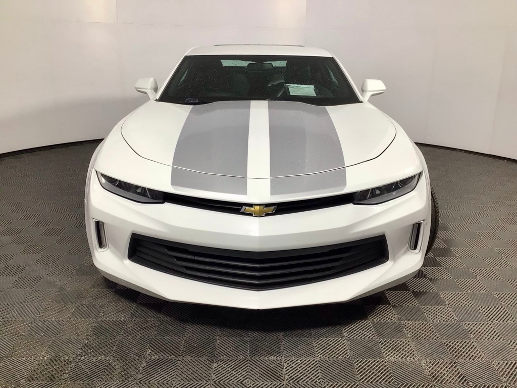 2017 Chevrolet Camaro 2LT, finished in classic Summit White with a standout Ceramic White interior and accent trim package. Powered by a spirited 2.0L Turbo 4-cylinder engine paired with a 6-speed manual transmission, this rear-wheel-drive coupe delivers an engaging, athletic performance with its Sport Suspension, variable-ratio electric power steering, and dual-outlet stainless-steel exhaust. Its sleek exterior is enhanced by Silver Rally Stripes, heated power-adjustable body-color mirrors, and bold 18" silver-painted aluminum wheels for a clean, confident look.