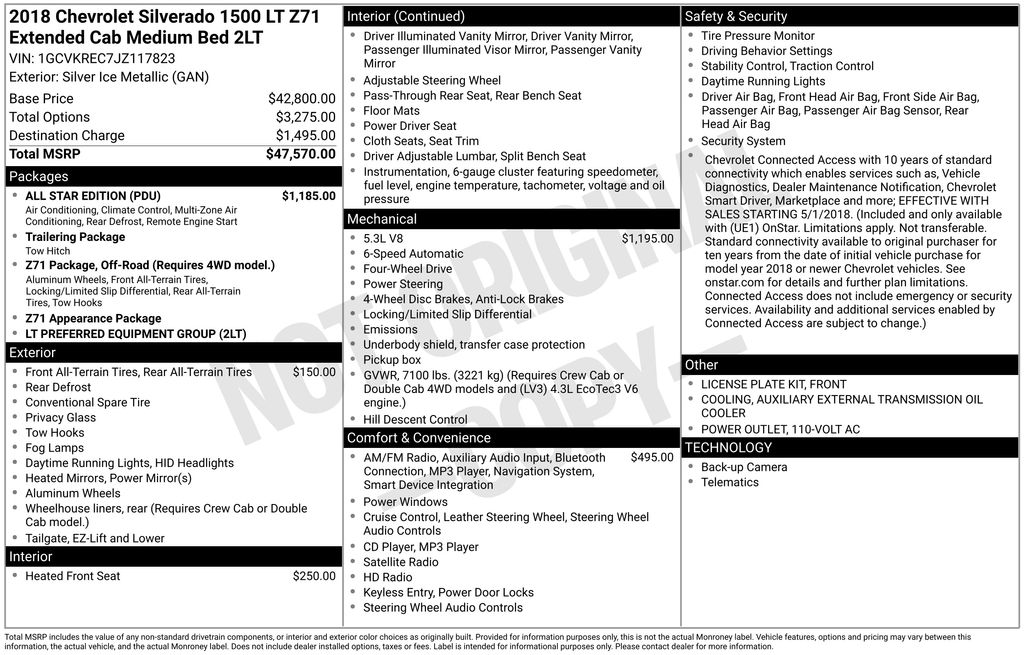 A short drive from Athens, Cambridge, Chillicothe, Circleville, Columbus, Lancaster, Logan, Marietta, Nelsonville, Newark, Pickerington, Pomeroy, and Zanesville in Ohio, as well as Charleston, Clarksburg, Huntington, Morgantown, Parkersburg, Vienna, and Wheeling in West Virginia. 2065 East State St. Athens, OH 45701. Near Ohio University! Down the road from Hocking Hills! Vehicle: 2018 Chevrolet Silverado 1500 LT Price: 27287 (live market adjusted) CarFax: True, available today Stock#: F316059PAT VIN Ending: 1GCVKREC7JZ117823 Delivery: Nationwide delivery available.