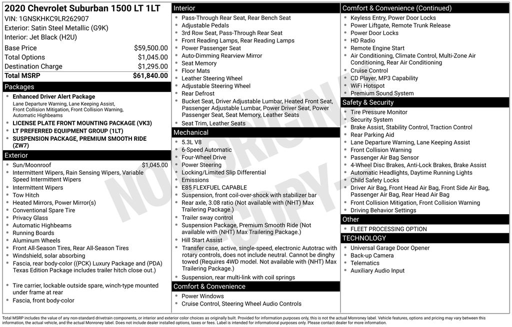 A short drive from Athens, Cambridge, Chillicothe, Circleville, Columbus, Lancaster, Logan, Marietta, Nelsonville, Newark, Pickerington, Pomeroy, and Zanesville in Ohio, as well as Charleston, Clarksburg, Huntington, Morgantown, Parkersburg, Vienna, and Wheeling in West Virginia. 2065 East State St. Athens, OH 45701. Near Ohio University! Down the road from Hocking Hills! Vehicle: 2020 Chevrolet Suburban LT Price: 26187 (live market adjusted) CarFax: True, available today Stock#: F262907P VIN Ending: 1GNSKHKC9LR262907 Delivery: Nationwide delivery available.