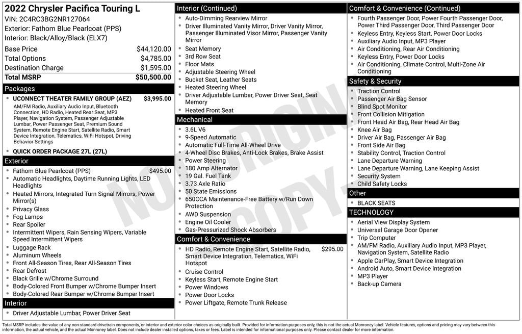 A short drive from Athens, Cambridge, Chillicothe, Circleville, Columbus, Lancaster, Logan, Marietta, Nelsonville, Newark, Pickerington, Sandusky, and Zanesville in Ohio, as well as Charleston, Clarksburg, Huntington, Morgantown, Parkersburg, Vienna, and Wheeling in West Virginia. 27350 Darl Rd. Rockbridge, OH 43149. Located in the Hocking Hills! Close to Ohio University! Vehicle: 2022 Chrysler Pacifica Touring L Price: 28999 (live market adjusted) CarFax: True, available today Stock#: J711601BT | VIN Ending: 2C4RC3BG2NR127064 Delivery: Nationwide delivery available.