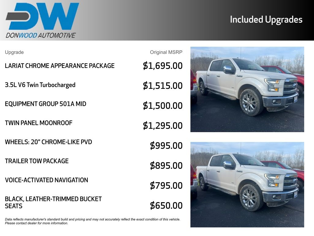 Clean CARFAX!, This Ford F-150 Lariat has many features and is well equipped including, Heated Seats, Ventilated Seats, Leather Seats, 4-Wheel Drive, 110V/400W Outlet, 18" Chrome-Like PVD Wheels, 7 Speakers, Air Conditioning, Auto-dimming door mirrors, Auto-dimming Rear-View mirror, Automatic temperature control, Auxiliary Transmission Oil Cooler, BLIS Blind Spot Information System, Chrome 3-Bar Style Grille w/Chrome Surround, Chrome Angular Step Bars, Chrome Door & Tailgate Handles w/Body-Color Bezel, Chrome Skull Caps on Exterior Mirrors, Class IV Trailer Hitch Receiver, Delay-off headlights, Dual-Zone Automatic Temperature Control, Equipment Group 501A Mid, Exterior Parking Camera Rear, Fully automatic headlights, Heated front seats, Lariat Chrome Appearance Package, Leather-Trimmed 40/20/40 Front Seat, LED Side-Mirror Spotlights, Memory seat, Pedal memory, Power Glass Sideview Mirr w/Body-Color Skull Caps, Pro Trailer Backup Assist, Radio: Sony Single CD w/HD & SiriusXM Satellite, Remote Start System w/Remote Tailgate Release, Reverse Sensing System, Single-Tip Chrome Exhaust, Split folding rear seat, Trailer Tow Package, Universal Garage Door Opener, Upgraded Front Stabilizer Bar, Ventilated front seats.
