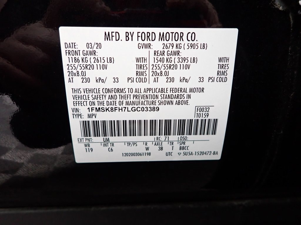 4WD, Power Hands-Free Liftgate, SYNC 3 With 8-Inch Touchscreen And Voice-Activated Navigation, B&O Sound System With 12 Speakers, Wireless Charging Pad, Intelligent Access With Push-Button Start, Remote Start System, Heated And Ventilated Front Seats, Heated Second-Row Seats, Heated Leather-Wrapped Steering Wheel With Cruise And Audio Controls, Leather-Trimmed Seating Surfaces With 10-Way Power Driver And Passenger Seats And Driver Memory, Power Tilt And Telescoping Steering Column, Tri-Zone Electronic Temperature Control, 360-Degree Camera System, Ford Co-Pilot360 Assist+, Adaptive Cruise Control, Lane Keeping System, Pre-Collision Assist With Automatic Emergency Braking, Blind Spot Information System With Cross-Traffic Alert, Reverse Sensing System, Rear View Camera, SecuriCode Keyless Keypad, Side-Wind Stabilization, Power-Folding Third-Row Seat, Ambient Interior Lighting With Illuminated Entry, Auto-Dimming Interior Rearview Mirror, Smart Charging USB Ports, 110-Volt AC Power Outlet, Rotary Gear Shift Dial, LED Headlamps With Signature Lighting, LED Fog Lamps, LED Taillamps, Rain-Sensing Windshield Wipers, Windshield Wiper De-Icer, Power-Folding Heated Exterior Mirrors With Auto-Fold Memory And Approach Lamps, Rear Privacy Glass, Satin Roof-Rack Side Rails, Dual Chrome Exhaust Tips, Trailer Sway Control, AdvanceTrac With Roll Stability Control, Personal Safety System, Dual-Stage Front Airbags, Front Seat-Mounted Side-Impact Airbags, Safety Canopy Airbags, LATCH Child Safety System, Perimeter Alarm, SOS Post-Crash Alert System, Individual Tire Pressure Monitoring System, Easy Fuel Capless Filler, 2.3L EcoBoost Engine, Ten-Speed Automatic Transmission, Four-Wheel Drive..