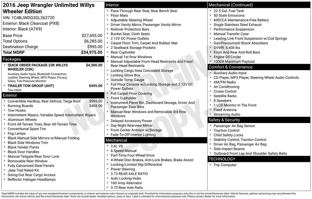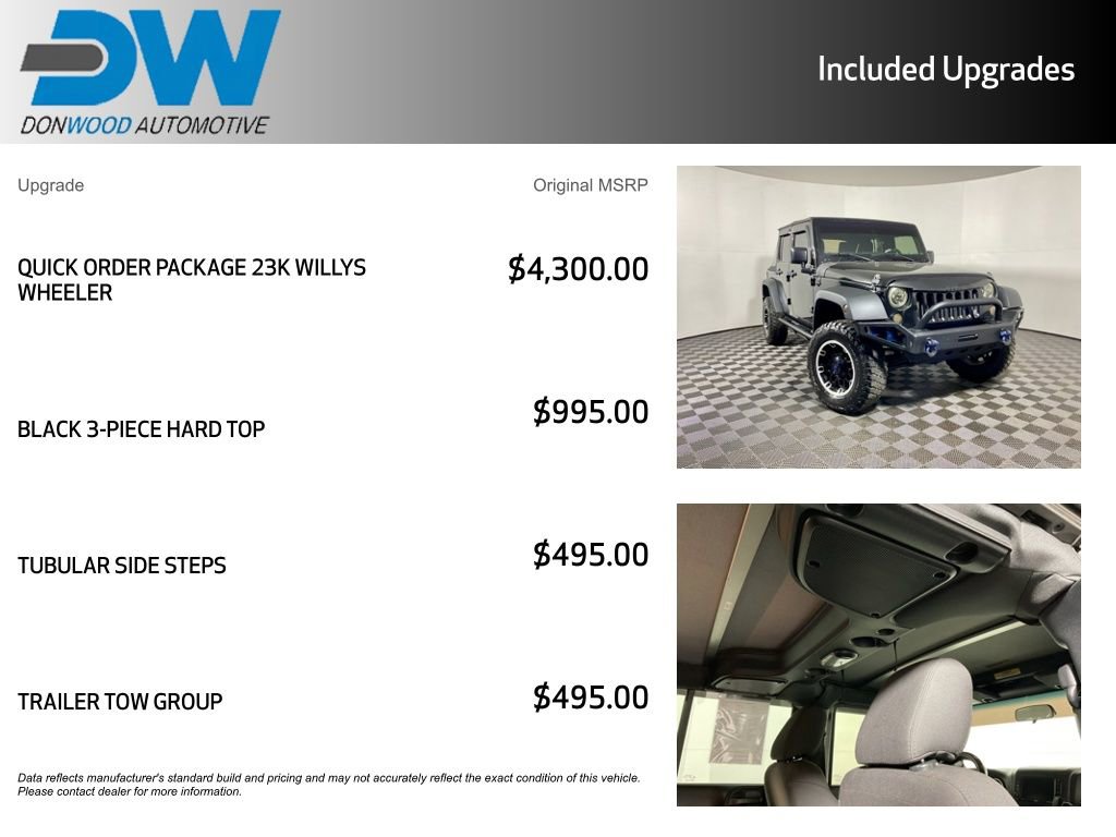 Clean CARFAX! SiriusXM Satellite Radio, Audio Jack Input For Mobile Devices, Radio 130 With Eight Speakers; Cloth Seats With Adjustable Head Restraints, Reclining Front Seats, Driver Seat Height Adjuster, Rear 60/40 Folding Seat, Leather-Wrapped Steering Wheel, Steering Wheel Mounted Audio Controls, Premium Instrument Cluster With Tachometer, Temperature And Compass Gauge, Air Conditioning, Rear Compartment Covered Storage, Cargo Tie Down Loops, Full-Length Floor Console, Sliding Sun Visors With Mirrors, Front And Rear Floor Mats; Advanced Multistage Front Airbags, Electronic Stability Control, Traction Control, Electronic Roll Mitigation, Hill Start Assist, Trailer Sway Damping, Tire Pressure Monitor With Warning Lamp, Sentry Key Theft Deterrent System; Sunrider Soft Top, Freedom Top Three-Piece Hard Top, Full Metal Doors With Roll-Up Windows, Deep Tint Sunscreen Windows, Fog Lamps, Two Front Tow Hooks And One Rear Tow Hook, Rock Rails, Tubular Side Steps, Willys Wheeler Grille, Willys Hood Decal, Trail Rated Badge, 17-Inch High Gloss Black Wheels, LT255/75R17 Off-Road Tires. This configuration emphasizes rugged capability with off-road tires, rock rails, and heavy-duty axles, complemented by skid plates and tow hooks for demanding terrain. Comfort features such as adjustable seating, leather-wrapped steering wheel, and air conditioning enhance usability, while storage solutions and floor mats add practicality. Safety technologies combine proactive stability systems and trailer sway damping with comprehensive airbag coverage for secure travel. Exterior elements deliver durability and style with Willys-specific accents, fog lamps, and convertible top options for open-air versatility. After these highlights, the vehicle includes Four-Wheel Drive capability through Command-Trac Shift-On-The-Fly and a 3.6-Liter V6 24-Valve Variable Valve Timing Engine paired with a 3.73 Axle Ratio to deliver dependable strength for off-road performance..