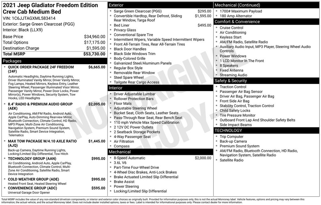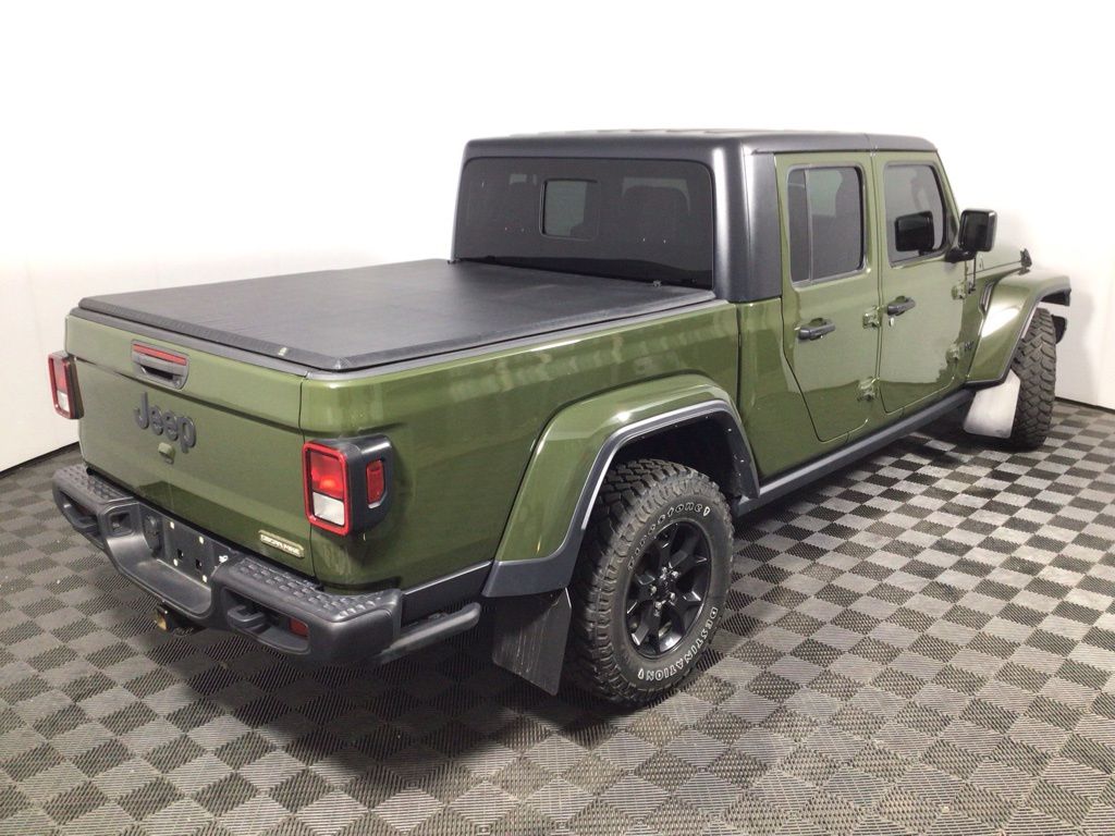 This Jeep Gladiator Freedom has many features and is well equipped including, Apple CarPlay, Heated Steering Wheel, Heated Seats, Remote Vehicle Start, Captain's Chairs, Navigation, Great Price, Backup Camera, 4-Wheel Drive, 1-Year SiriusXM Guardian Trial, 115V Auxiliary Power Outlet, 2 Front & 2 Rear Tow Hooks, 240 Amp Alternator, 4-Wheel Disc Brakes, 4.10 Rear End, 400W Inverter, 5-Year SiriusXM Traffic Service, 5-Year SiriusXM Travel Link Service, 7.0" Touch Screen Display, 8.4" Radio & Premium Audio Group, 8.4" Touchscreen Display, ABS Brakes, Air Conditioning w/Auto Temperature Control, Alpine Premium Audio System, American Flag Decals, Anti-Lock 4-Wheel Disc Heavy Duty Brakes, Anti-Spin Differential Rear Axle, Apple CarPlay, Auto High Beam Headlamp Control, Auto-Dimming Rear-View Mirror, Automatic Headlamps, Black 3-Piece Hard Top, Black Molded-In-Color Fender Flares (2-Piece), Black Trail Rated Badge, Body Color Fender Flares (2-Piece), Class IV Hitch Receiver, Cluster 7.0" TFT Color Display, Console Bin Task Light, Dana M210 Wide Front Axle, Dana M220 Wide Rear Axle, Daytime Running Lamp System, Deep Tint Sunscreen Windows, Emergency/Assistance Call, Freedom Edition Interior Accents, Freedom Edition Package, Freedom Package Decals, Freedom Panel Storage Bag, Front 1-Touch Down Power Windows, Front Bucket Seats, Google Android Auto, GPS Navigation, GVWR: 6,250 lbs w/Max Tow Package, HD Radio, Heated Front Seats, Heated Steering Wheel, Heavy-Duty Engine Cooling, Integrated Center Stack Radio, Integrated Voice Command w/Bluetooth, Leather Trimmed Cloth Bucket Seats (DISC), Leather Wrapped Steering Wheel, LED Headlamp & Fog Lamp Group, Max Tow Package w/4.10 Axle Ratio, Max Tow Package w/4.10 Axle Ratio (DISC), Media Hub w/2 Charge Only USBs, Navigation System, Normal Duty Plus Suspension, Off-Road Info Pages, Oscar Mike Badge, ParkSense Rear Park Assist System, ParkView Rear Back-Up Camera, Power Heated Mirrors, Power Tailgate Lock, Premium Black Sunrider Soft Top, Quick Order Package 24F Freedom (DISC), Radio: Uconnect 4 w/7" Display, Radio: Uconnect 4C Nav w/8.4" Display, Rear Sliding Window, Rear Window Defroster, Remote Keyless Entry, Remote Start System, Rock Protection Sill Rails, Security Alarm, SiriusXM Satellite Radio, SiriusXM Traffic Plus, SiriusXM Travel Link, Speed Sensitive Power Locks, Steel Front Bumper, Steel Rear Bumper, Sun Visors w/Illuminated Vanity Mirrors, Technology Group, Telescoping Steering Wheel, Traction Control, Trailer Hitch Zoom, Trailer Tow Package, USB Host Flip, Wheels: 17" x 7.5" Satin Carbon Painted (DISC).