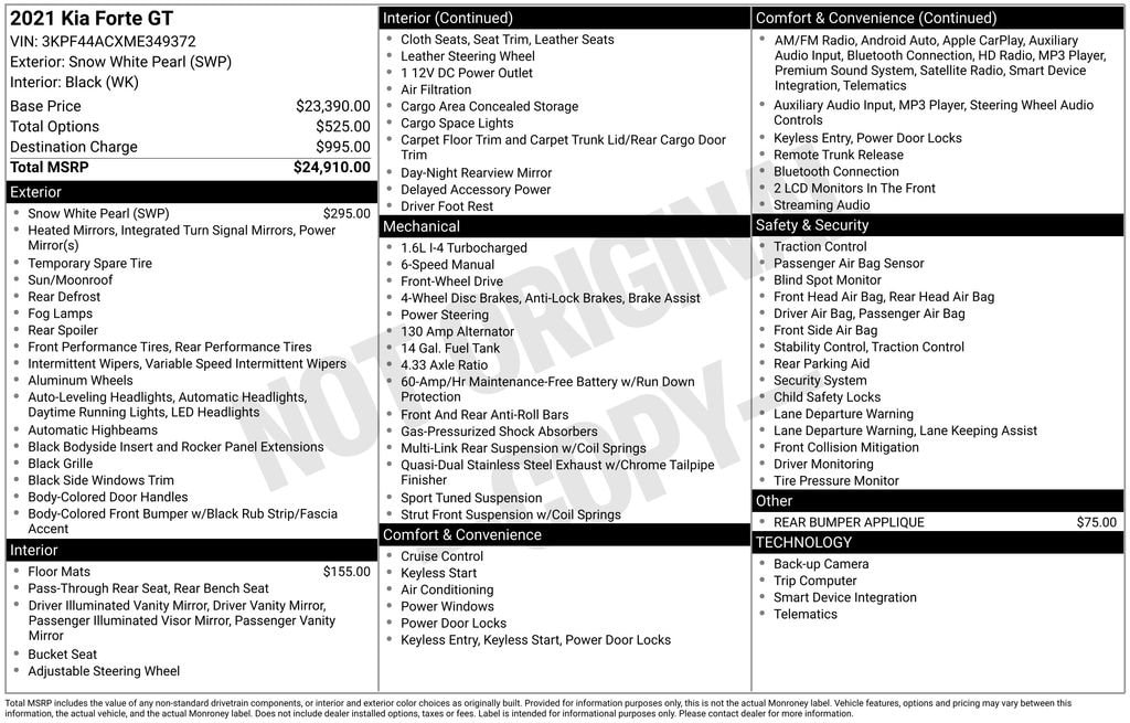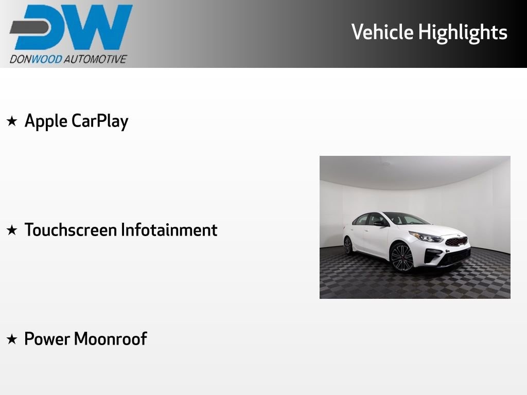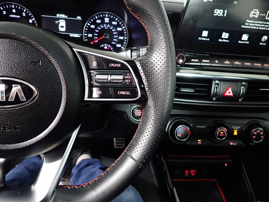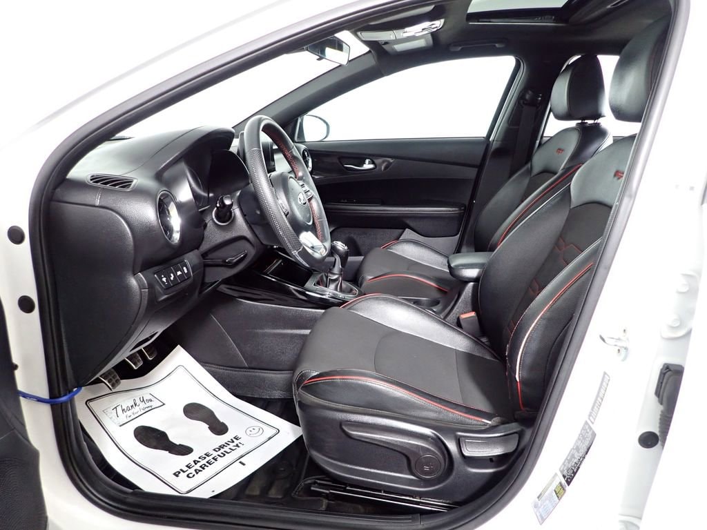 This Kia Forte GT has many features and is well equipped including, Apple CarPlay, Touchscreen Infotainment, Power Moonroof, 8 Speakers, Air Conditioning, Apple CarPlay & Android Auto, Cloth & Leatherette Seat Trim, Front Sport Seats, Heated door mirrors, Overhead console, Panic Alarm, Panoramic Power Moonroof, Power door mirrors, Radio: AM/FM/MP3 harman/kardon Premium Audio System, Remote Keyless Entry, Security System, Speed control, Steering wheel mounted audio controls, Wheels: 18 Machine Finish Alloy.