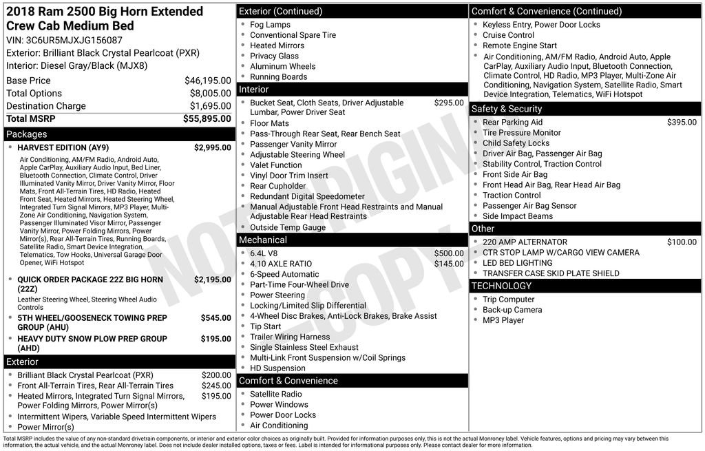 A short drive from Athens, Cambridge, Chillicothe, Circleville, Columbus, Lancaster, Logan, Marietta, Nelsonville, Newark, Pickerington, Sandusky, and Zanesville in Ohio, as well as Charleston, Clarksburg, Huntington, Morgantown, Parkersburg, Vienna, and Wheeling in West Virginia. 27350 Darl Rd. Rockbridge, OH 43149. Located in the Hocking Hills! Close to Ohio University! Vehicle: 2018 Ram 2500 Big Horn Harvest Edition Price: 31999 (live market adjusted) CarFax: True, available today Stock#: J156087P | VIN Ending: 3C6UR5MJXJG156087 Delivery: Nationwide delivery available.