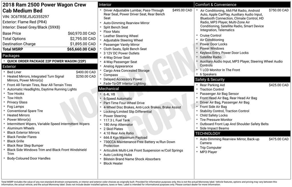 This Ram 2500 Power Wagon has many features and is well equipped including, Good Price, Great Price, Backup Camera, 4-Wheel Drive, Block heater, Exterior Mirrors w/Heating Element, Exterior Mirrors w/Supplemental Signals, Flat Black 6.4L Hemi Badge, Flat Black Ram 2500 Badge.