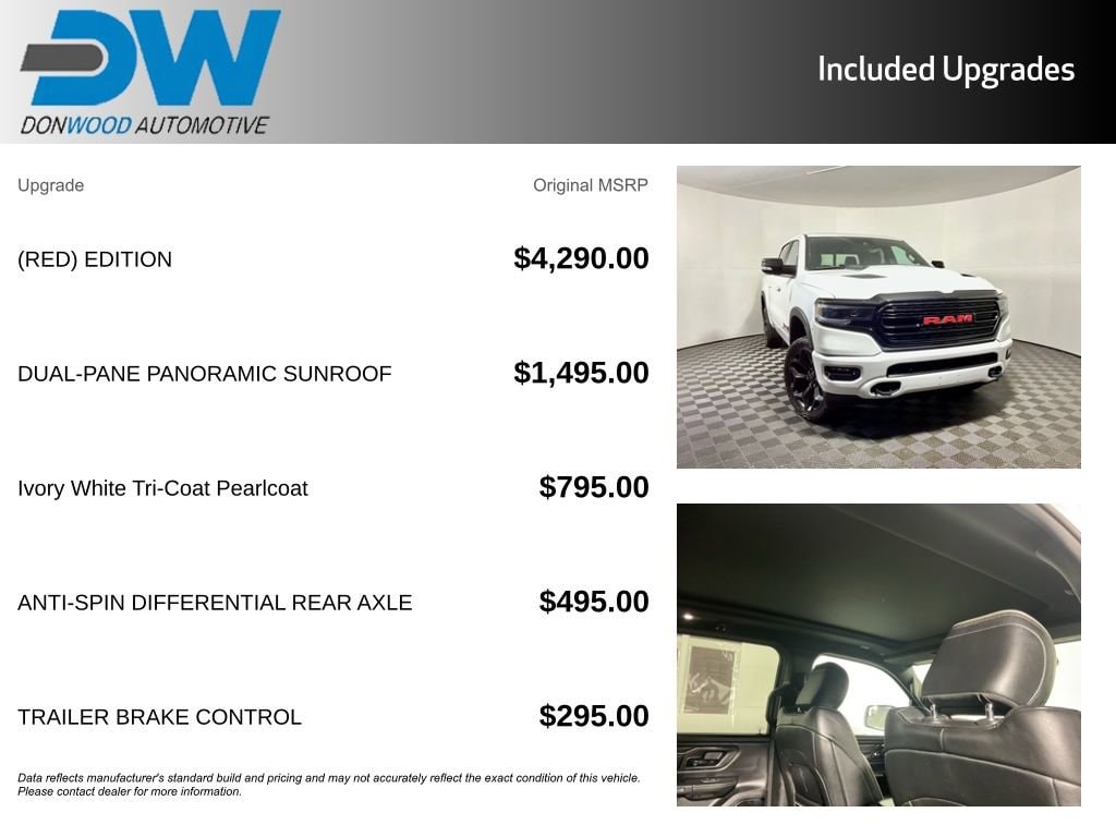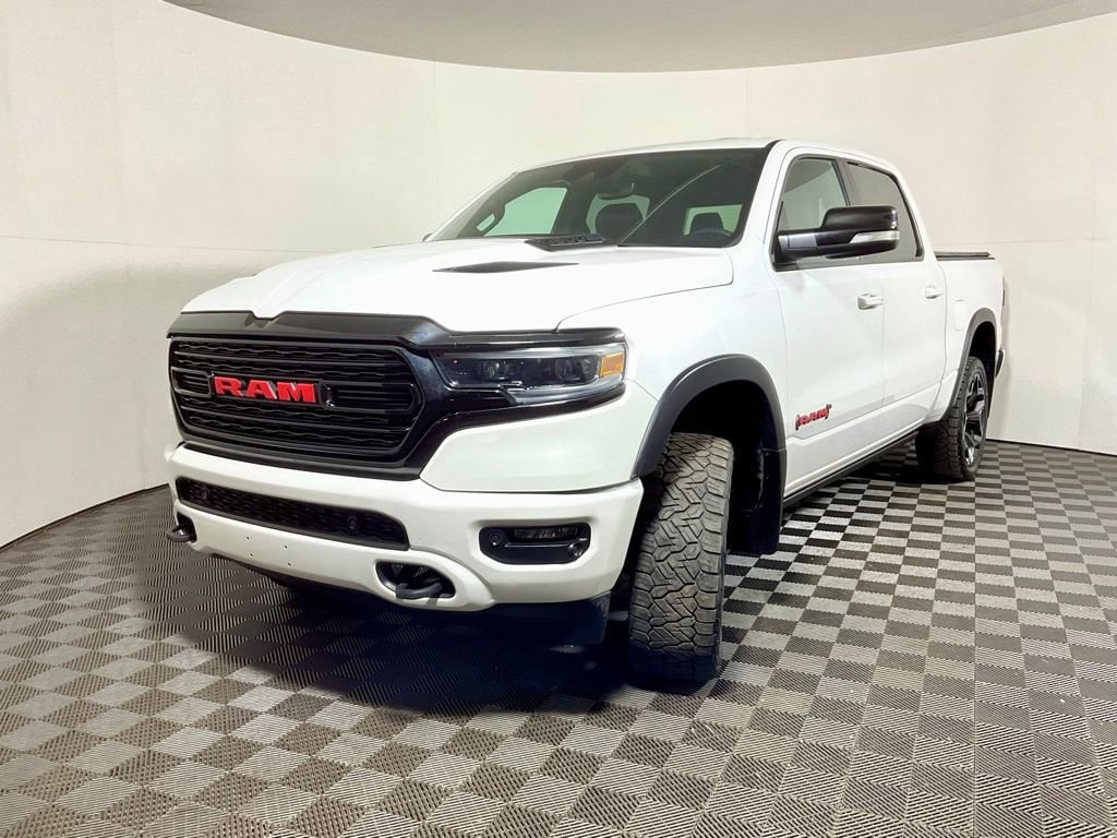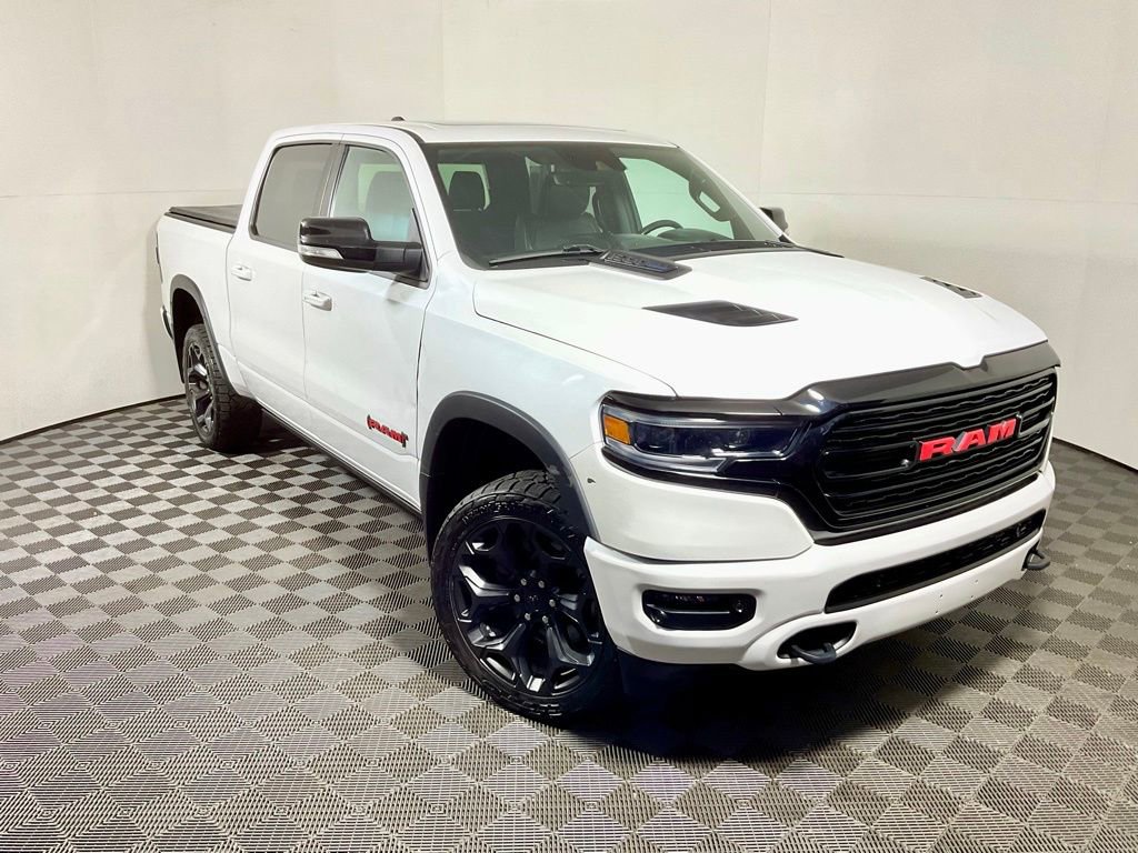1500 Limited, 4D Crew Cab, HEMI 5.7L V8 Multi Displacement VVT, Ivory White Tri-Coat Pearlcoat, Black Leather, Clean CARFAX!, (Red) Edition, 48V Belt Starter Generator, Accent Color Premium Power Mirrors, Auto-Dimming Exterior Driver Mirror, Auto-Dimming Exterior Passenger Mirror, Auto-leveling suspension, Black Day Light Opening Moldings, Black Exterior Truck Badging, Black Grille Surround Texture 7 Black, Black Headlamp Bezels, Black Painted Exterior Mirrors Caps, Body Color Door Handles, Body Color Front Bumper, Body Color Rear Bumper w/Step Pads, Convex Wide-Angle Mirror Insert, Dual Exhaust w/Black Tips, Exterior Mirrors Courtesy Lamps, Exterior Mirrors w/Heating Element, Exterior Mirrors w/Memory, Exterior Mirrors w/Supplemental Signals, harman/kardon 19 Speaker Premium Sound, Heated Second Row Seats, Heavy-Duty Engine Cooling, Navigation System, Power-Folding Mirrors, Quick Order Package 27M Limited, RAM Grille Badge - Red, RAM Red Door Badges, Red Edition Console Badge, Sport Performance Hood, Tow Hooks, Tri-Fold Tonneau Cover, Wheels: 22 x 9 Black Aluminum.