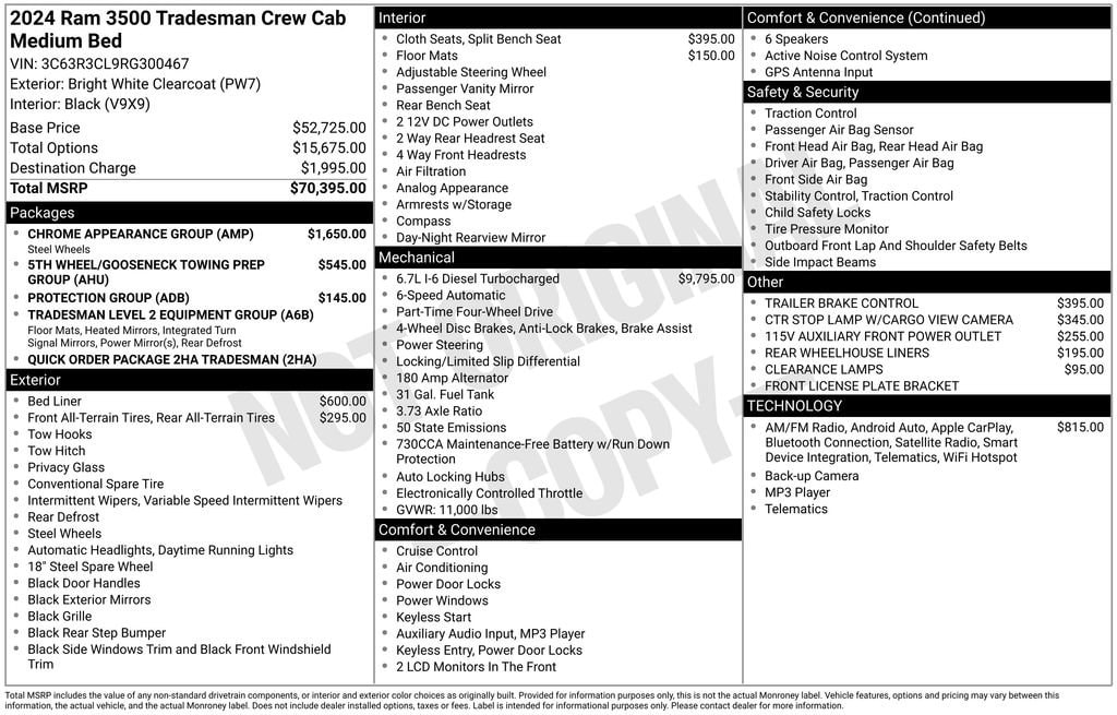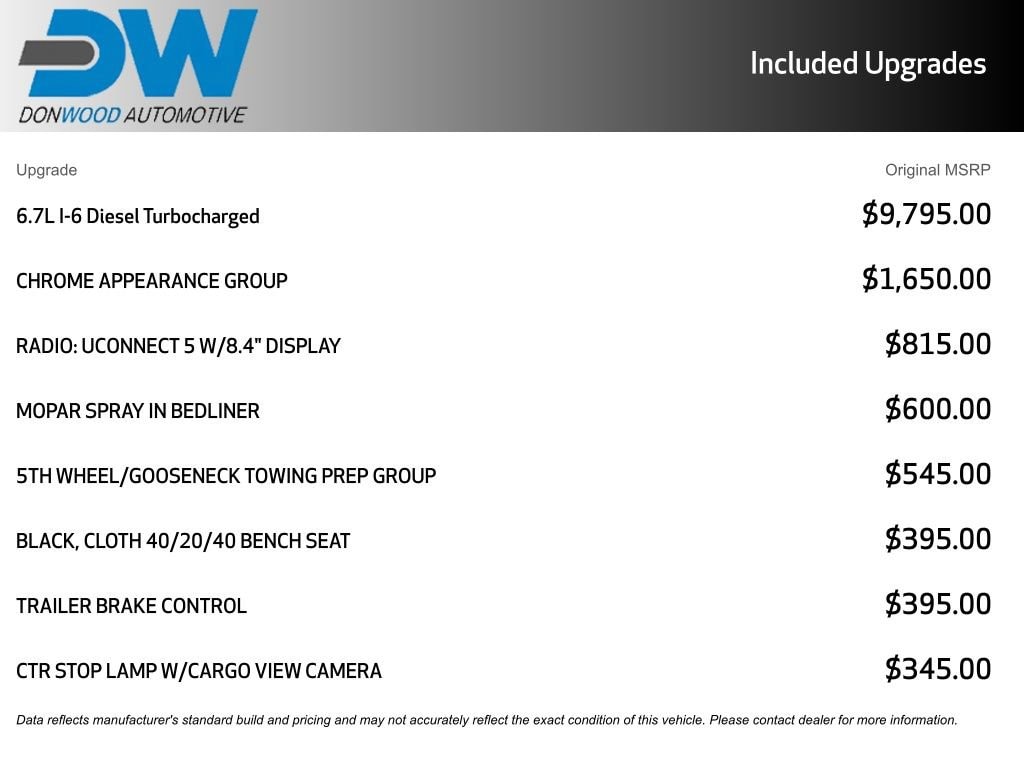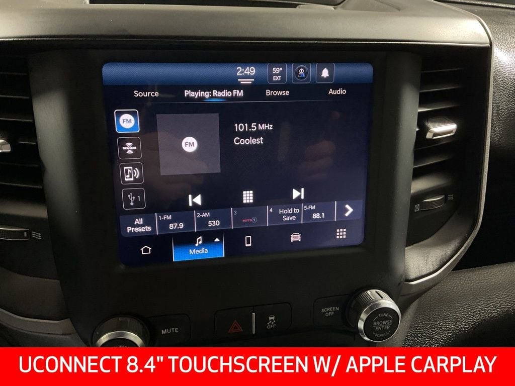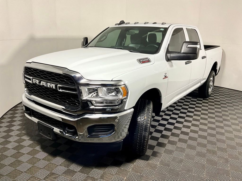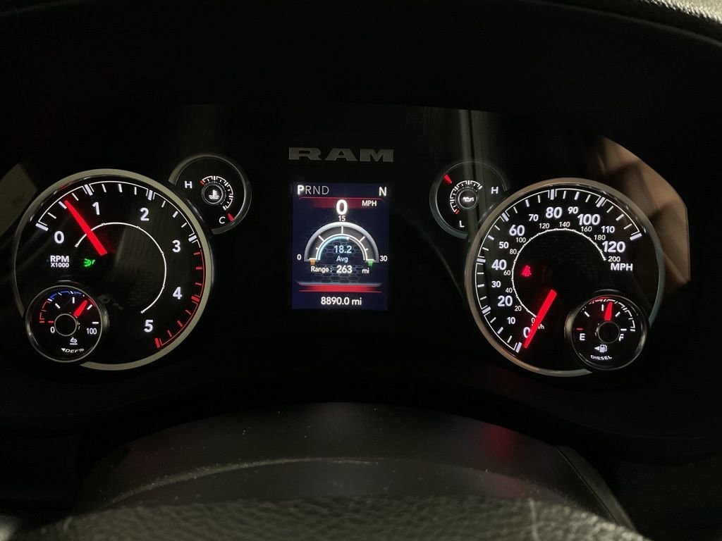 Clean One-Owner CARFAX! Uconnect 5 With 8.4-Inch Touchscreen Display, Apple CarPlay, Google Android Auto, Integrated Voice Command, SiriusXM Capability, Full-Function Media Hub With Two USB Ports And Auxiliary Input, 4G LTE Wi-Fi Hotspot, 115-Volt Auxiliary Front Power Outlet, Exterior 115-Volt AC Outlet With 400-Watt Inverter, Center Stop Lamp With Cargo-View Camera, Trailer Brake Controller, Remote Keyless Entry With Push-Button Start, Power Accessory Delay, Rear Power-Sliding Window With Defroster, Carpet Floor Covering, Front And Rear Rubber Floor Mats, Air Conditioning, Tilt Steering Column, Temperature And Compass Gauge Cluster With 3.5-Inch TFT Color Display, Rear Under-Seat Storage Compartment, Driver And Passenger Assist Handles; Advanced Multistage Front Airbags, Supplemental Side-Curtain Front And Rear Airbags, Supplemental Front Seat-Mounted Side Airbags, Electronic Stability Control, Traction Control, Anti-Lock Four-Wheel Disc Brakes, Trailer Sway Damping, Tire Pressure Information System With Selectable Tire-Fill Alert, Tailgate-Ajar Warning Lamp, Sentry Key Theft Deterrent System; Chrome Appearance Group Including Chrome Headlamp Bezels, Bright Front And Rear Bumpers, 18-Inch Steel Chrome-Clad Wheels, Manual-Folding Telescoping Mirrors With Heating Element And Supplemental Signals, Mirror Running Lights, Clearance Lamps, Spray-In Bedliner, Rear Wheelhouse Liners; Transfer Case Skid Plate Shield, 5th Wheel And Gooseneck Towing Prep Group; 6.7-Liter Inline Six Cummins Turbo Diesel Engine With Heavy-Duty Cooling, 3.73 Axle Ratio; Four-Wheel Drive. The Uconnect 5 System With Large Touchscreen And Smartphone Integration Simplifies Navigation, Audio, And Connectivity While SiriusXM And Wi-Fi Hotspot Expand Entertainment And Productivity Options. Comfort Features Such As Carpeted Flooring, Rear Sliding Window, And Multiple Power Outlets Enhance Daily Usability, While Safety Technologies Including Advanced Airbag Coverage, Electronic Stability Control, And Trailer Sway Damping Provide Confidence On The Road. Exterior Details Like Chrome Accents, Spray-In Bedliner, And Cargo-View Camera Combine Style With Practicality, And The Heavy-Duty Cummins Turbo Diesel Engine Paired With 5th Wheel Prep And Skid Plate Protection Delivers Exceptional Capability For Demanding Towing And Hauling Needs..
