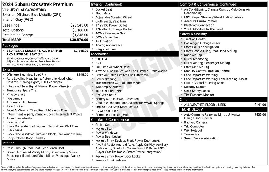 A short drive from Athens, Cambridge, Chillicothe, Circleville, Columbus, Lancaster, Logan, Marietta, Nelsonville, Newark, Pickerington, Pomeroy, and Zanesville in Ohio, as well as Charleston, Clarksburg, Huntington, Morgantown, Parkersburg, Vienna, and Wheeling in West Virginia. 2065 East State St. Athens, OH 45701. Near Ohio University! Down the road from Hocking Hills! Vehicle: 2024 Subaru Crosstrek Premium Price: (live market adjusted) CarFax: True, available today Stock#: FF84076AT VIN Ending: JF2GUADC4R8257403 Delivery: Nationwide delivery available.