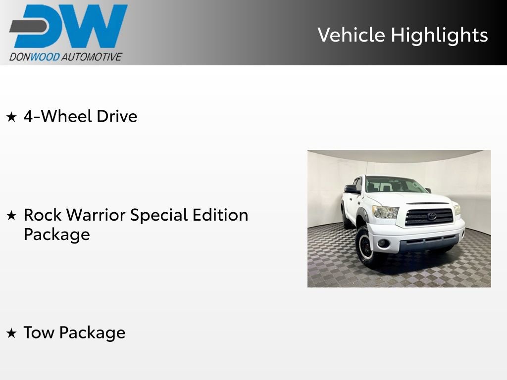 ROCK WARRIOR SPECIAL EDITION - TOW PACKAGE, i Force 5.7L V8 DOHC, 4-Wheel Drive, 130A Alternator, 17" TRD Forged Alloy Wheels, 3.73 Axle Ratio, 4.30 Rear Differential Automatic Limited Slip, 6 Speakers, ABS Brakes, Air Conditioning, AM/FM Stereo, Bilstein Shocks, Color-Keyed Front Bumper, Dual-Zone Automatic Temperature Control, Electronic Stability Control, Fabric Seat Trim w/Rock Warrior Special Edition, Front Fog & Driving Lamp, Illuminated entry, Low Tire Pressure Warning, Power door mirrors, Rear step bumper, Remote Keyless Entry, Rock Warrior Special Edition Package, Sliding Rear Window w/Privacy Glass, Sport Shift Knob, Supplemental Transmission Cooler, Tow Package, Traction Control, TRD Rock Warrior Graphics.