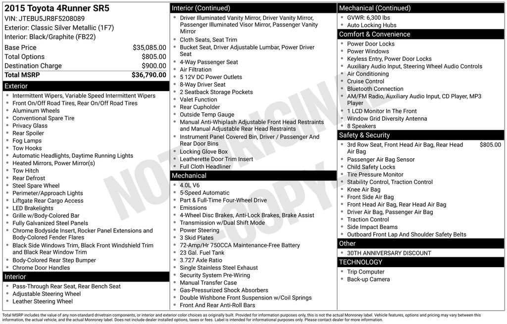 A short drive from Athens, Cambridge, Chillicothe, Circleville, Columbus, Lancaster, Logan, Marietta, Nelsonville, Newark, Pickerington, Pomeroy, and Zanesville in Ohio, as well as Charleston, Clarksburg, Huntington, Morgantown, Parkersburg, Vienna, and Wheeling in West Virginia. 900 East State St. Athens, OH 45701. Near Ohio University! Down the road from Hocking Hills! Vehicle: 2015 Toyota 4Runner Trail Premium Price: 17500 (live market adjusted) CarFax: True, available today Stock#: T208089C | VIN Ending: JTEBU5JR8F5208089 Delivery: Nationwide delivery available.