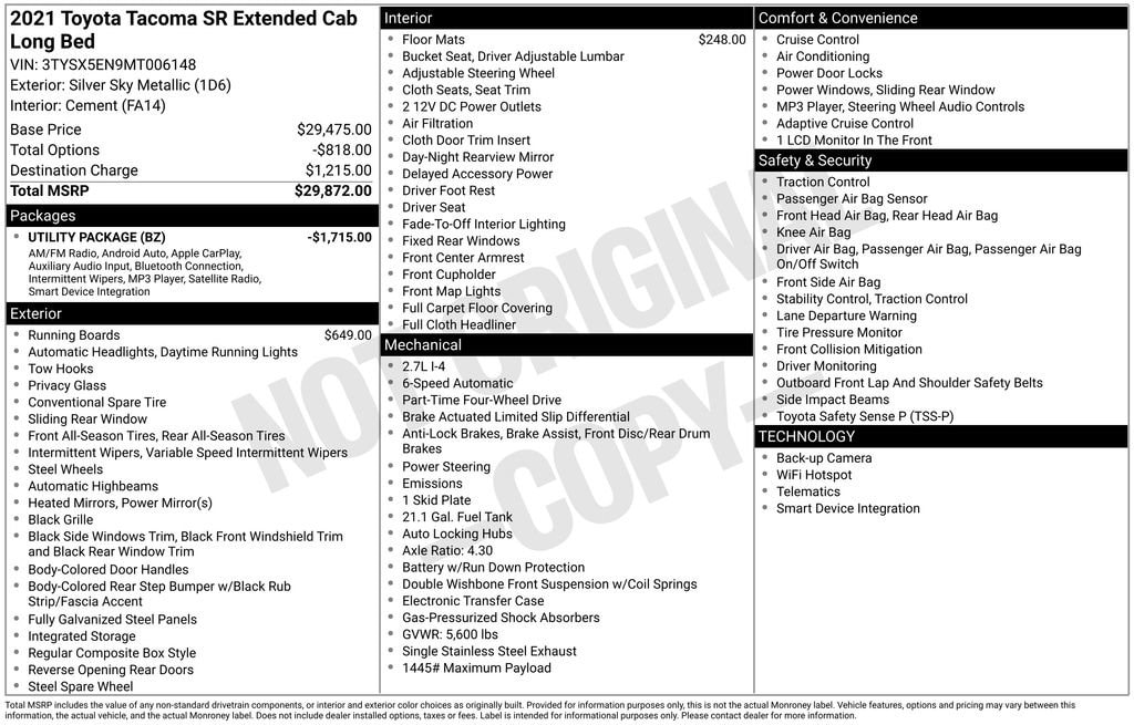 A short drive from Athens, Cambridge, Chillicothe, Circleville, Columbus, Lancaster, Logan, Marietta, Nelsonville, Newark, Pickerington, Pomeroy, and Zanesville in Ohio, as well as Charleston, Clarksburg, Huntington, Morgantown, Parkersburg, Vienna, and Wheeling in West Virginia. 900 East State St. Athens, OH 45701. Near Ohio University! Down the road from Hocking Hills! Vehicle: 2021 Toyota Tacoma SR Price: 24500 (live market adjusted) CarFax: True, available today Stock#: T006148P | VIN Ending: 3TYSX5EN9MT006148 Delivery: Nationwide delivery available.